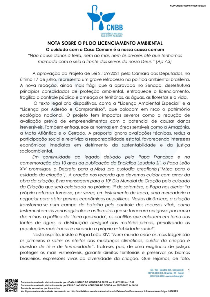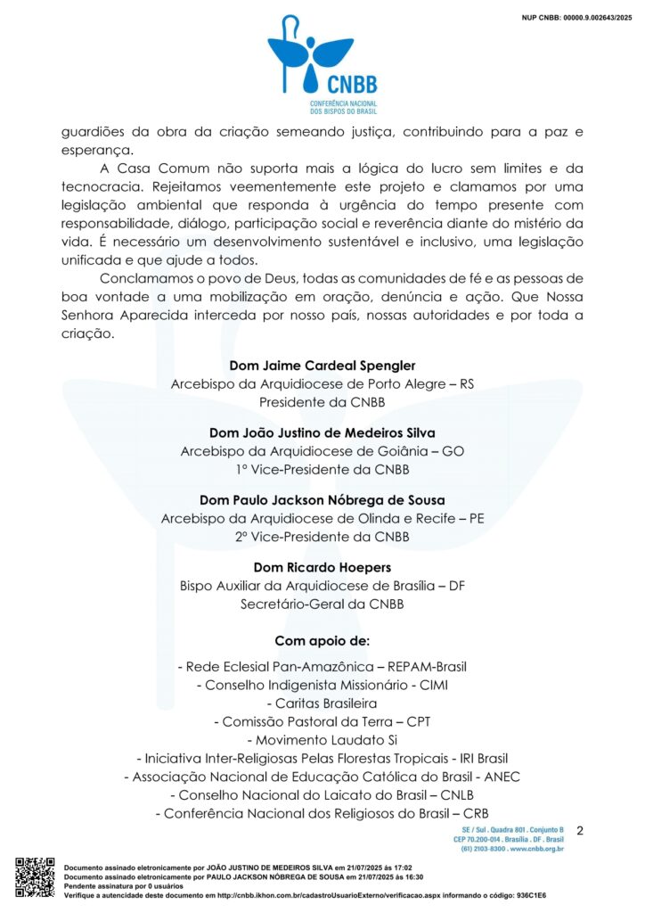 “Rejeitamos veementemente este projeto e clamamos por uma legislação ambiental que responda à urgência do tempo presente com responsabilidade, diálogo, participação social e reverência diante do mistério da vida. É necessário um desenvolvimento sustentável e inclusivo, uma legislação unificada e que ajude a todos”.
