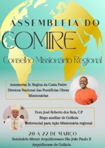 A comissão executiva do Conselho Missionário Regional (COMIRE) se reuniu no dia 21 de fevereiro, na sede do Regional Centro-Oeste da CNBB, em Goiânia, para organizar e planejar a sua Assembleia eletiva que acontecerá nos dias 20 a 22 de março, no Seminário Menor Arquidiocesano São João Paulo II, em Goiânia. Estiveram presentes na reunião, o coordenador do Conselho Missionário Regional Centro-Oeste, Michael Douglas; o bispo referencial Dom José Roberto e os demais membros da equipe. A Assembleia será assessorada pela Irmã Regina, diretora das Pontifícias Obras Missionárias (POM).