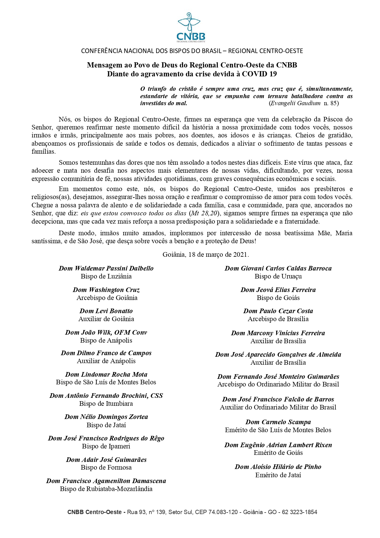 Em momentos como este, nós, os bispos do Regional Centro-Oeste, unidos aos presbíteros e religiosos(as), desejamos, assegurar-lhes nossa oração e reafirmar o compromisso de amor para com todos vocês. Chegue a nossa palavra de alento e de solidariedade a cada família, casa e comunidade, para que, ancorados no Senhor, que diz: eis que estou convosco todos os dias (Mt 28,20), sigamos sempre firmes na esperança que não decepciona, mas que cada vez mais reforça a nossa predisposição para a solidariedade e a fraternidade.